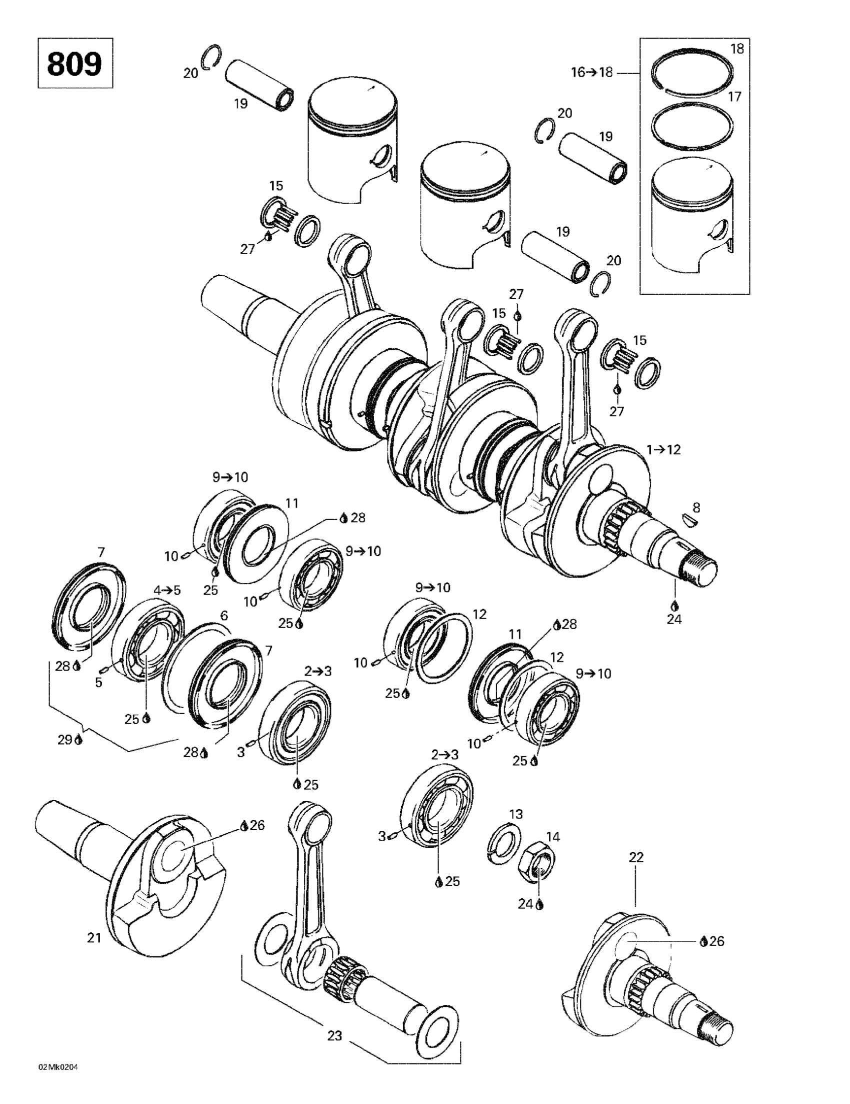 Ski-Doo Mach Z, 2002 Crankshaft And Pistons Diagram