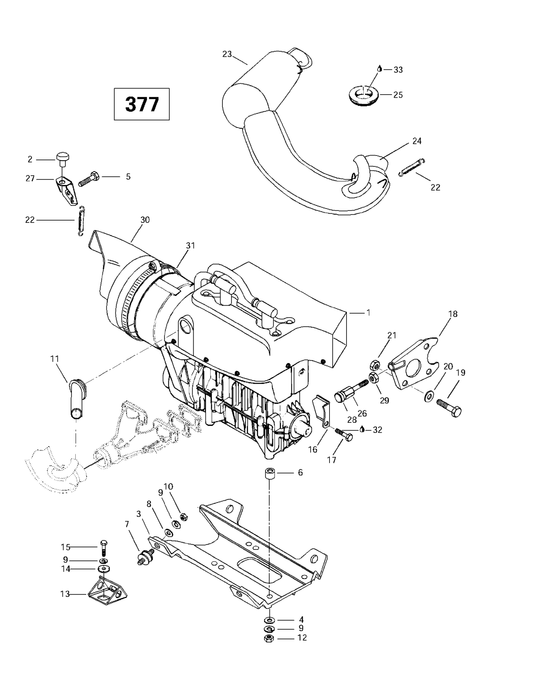 Ski-Doo Skandic 380/500, 1997 Engine Support And Muffler (377) Diagram