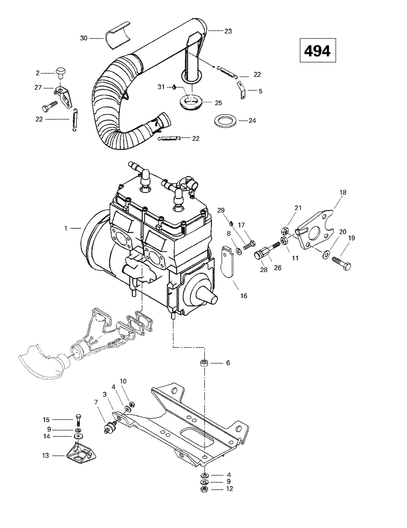 Ski-Doo Summit 500/583/670, 1998 Engine Support And Muffler (494) Diagram
