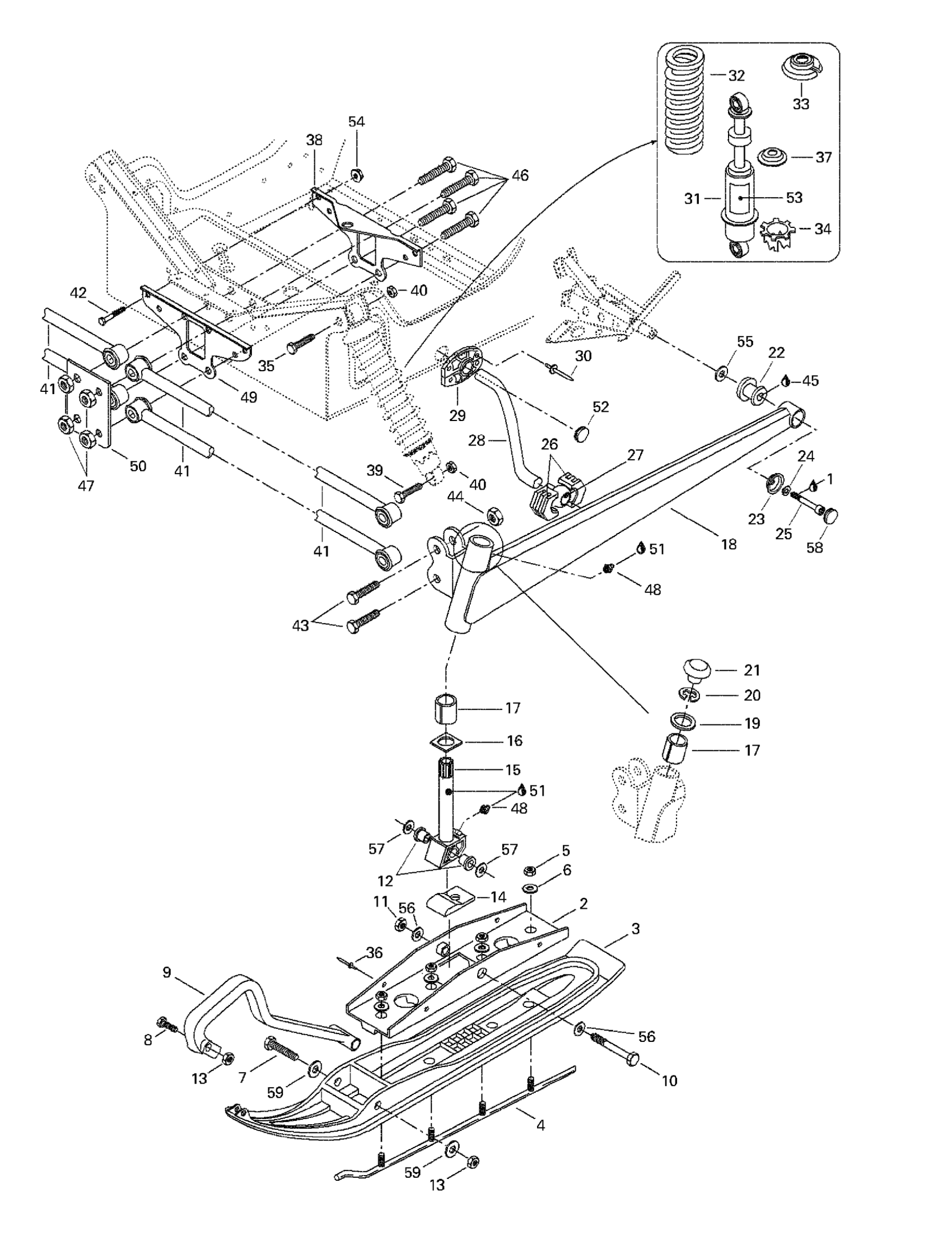Ski-Doo Summit 500/583/670, 1998 Front Suspension And Ski Diagram