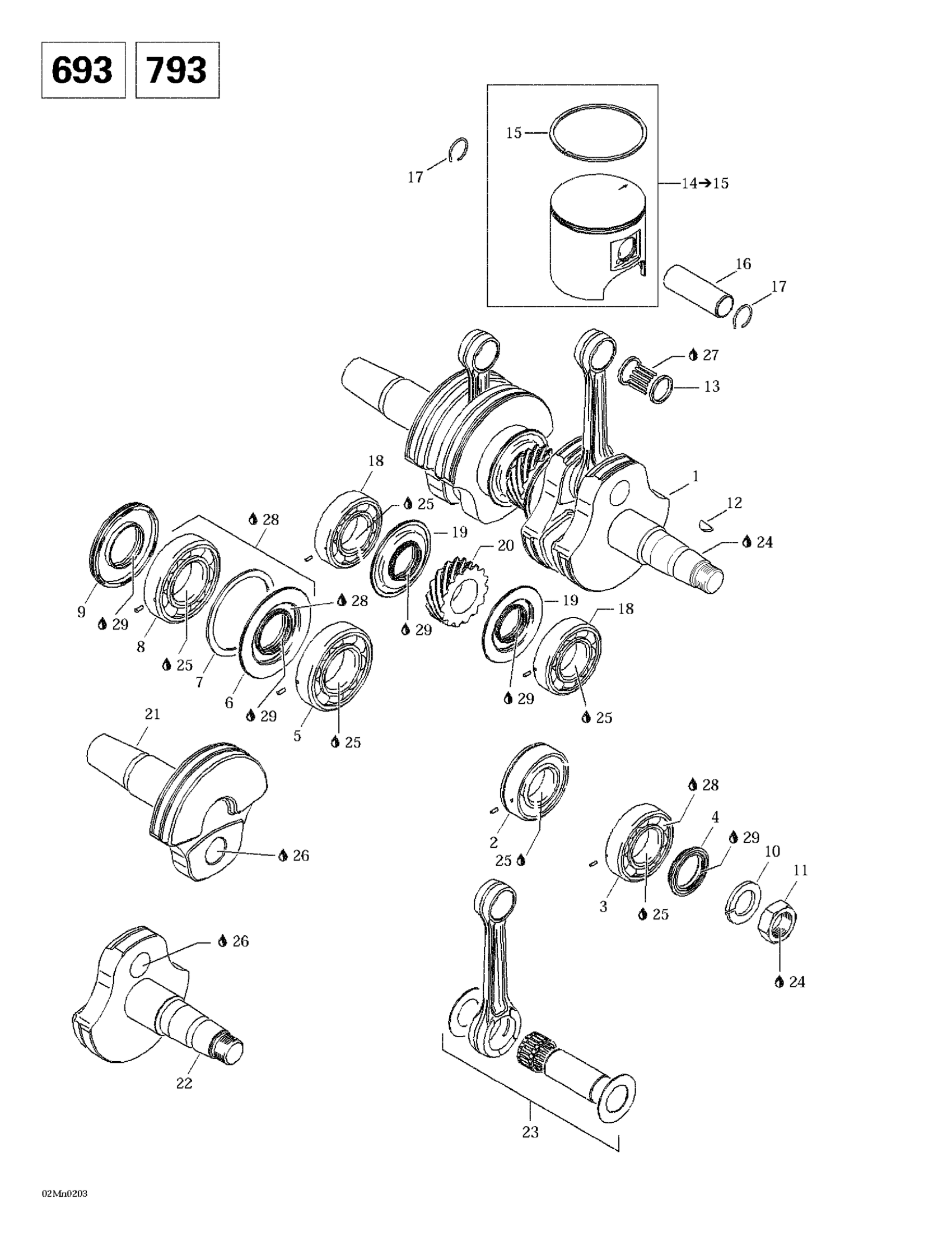 Ski-Doo Summit 600/700/800, 2002 Crankshaft And Pistons (693) Diagram