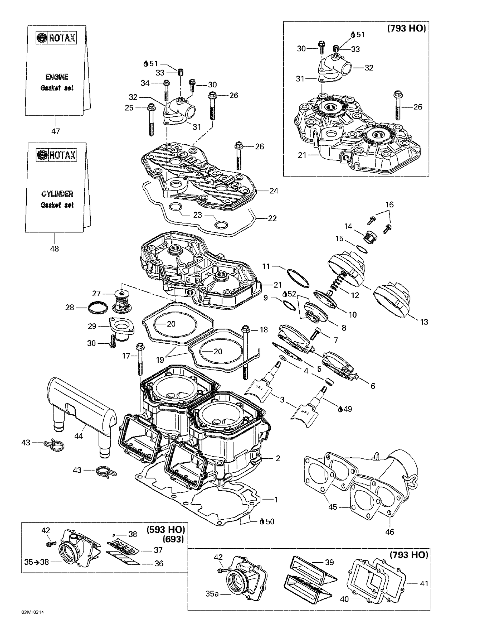Ski-Doo Summit 600 HO/700/800 HO, 2003 Cylinder, Exhaust Manifold, Reed Valve Diagram