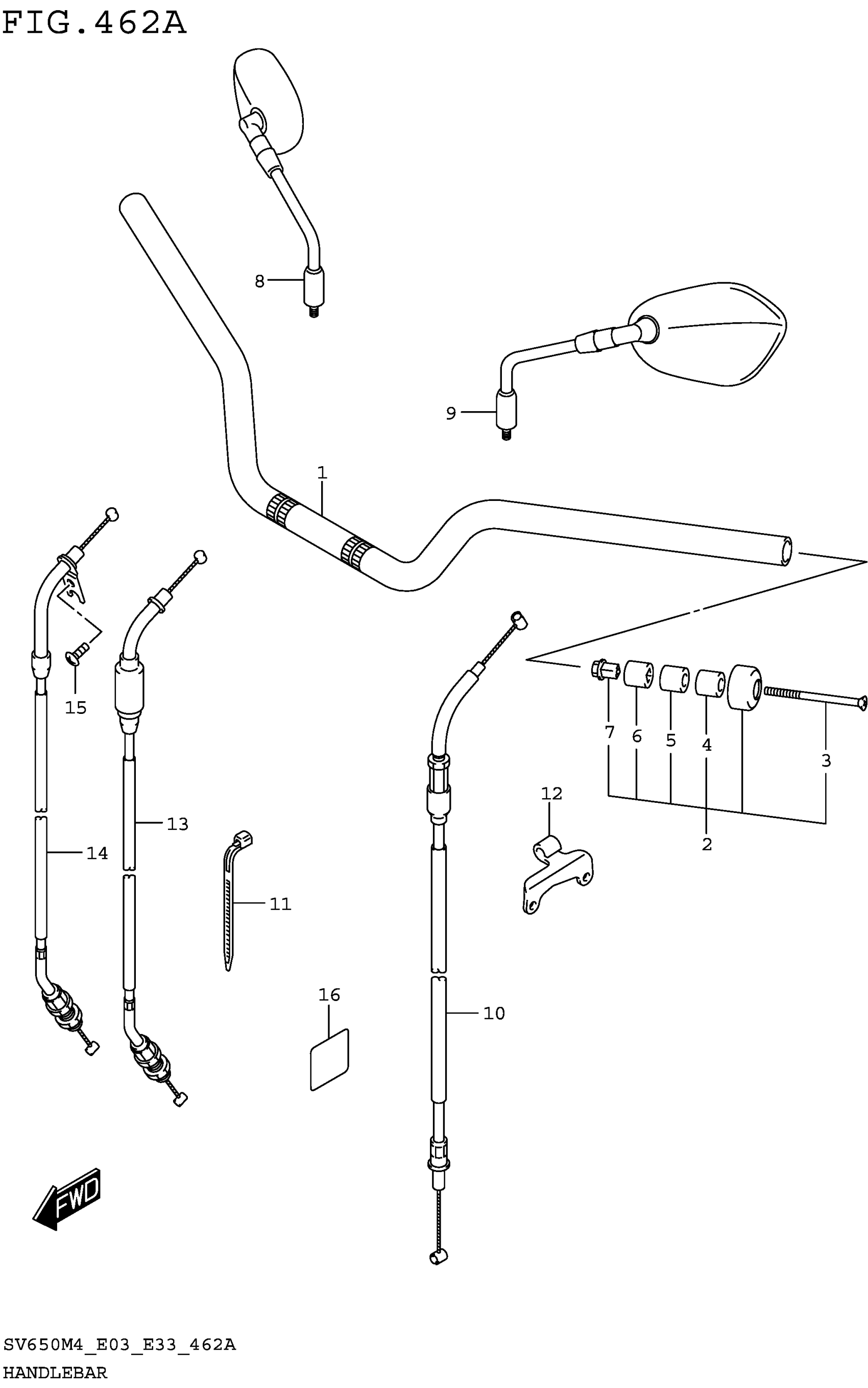 COLOR:KEL=YVB(BLACK)/YSF(BLUE) | FIG.462B(1-L-7 ) HANDLEBAR (SV650M4 E33) FIG.462C(1-L-8 ) HANDLEBAR (SV650AM4 E28) FIG.462D(1-L-9 ) HANDLEBAR (SV650AM4 E33) FIG.462E(1-L-10) HANDLEBAR (SV650XAM4 E28)