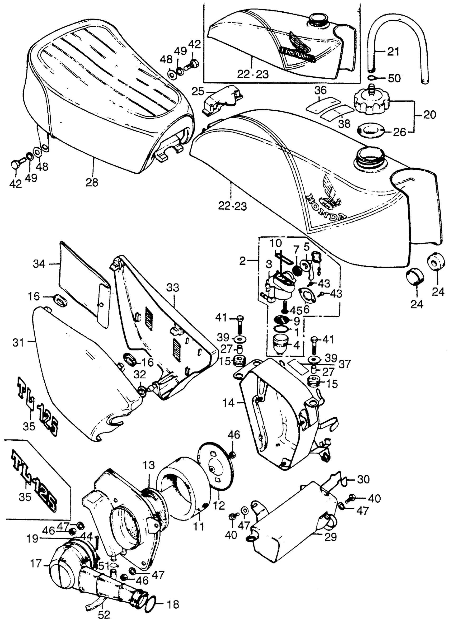 Honda TL125A MOTORCYCLE, JPN, VIN# TL125-1000003 FUEL TANK + SEAT + AIR CLEANER Diagram
