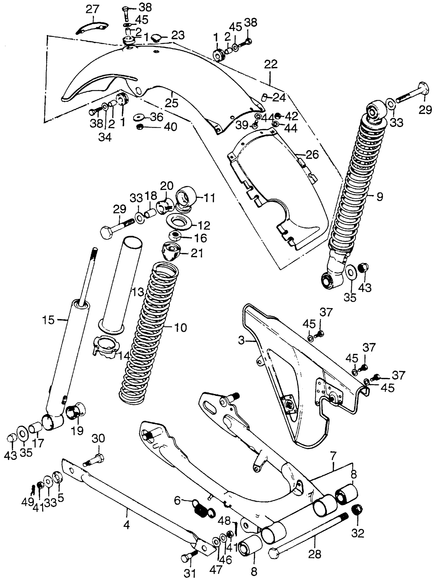 REAR SHOCK ABSORBER + REAR FENDER + SWINGARM