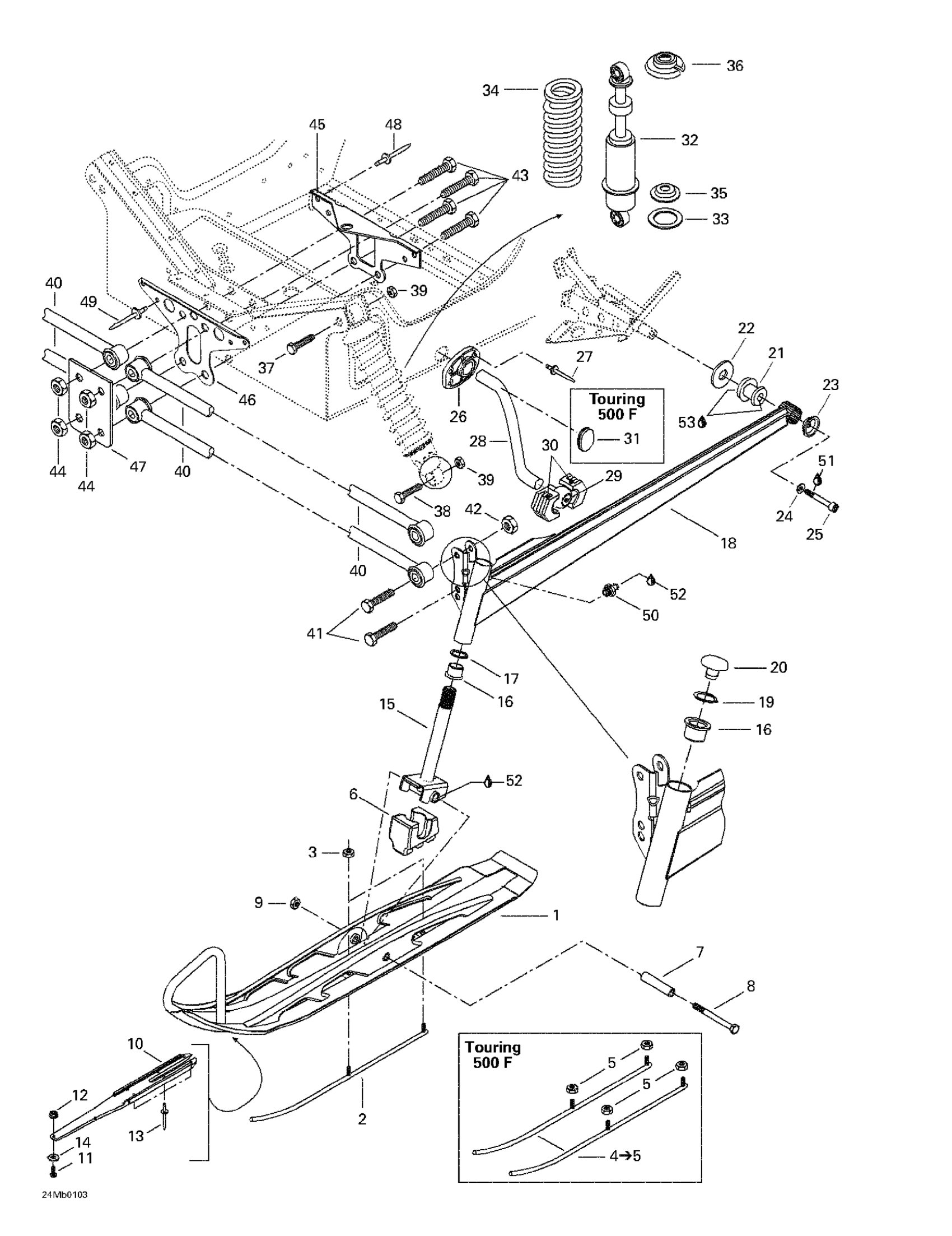 Ski-Doo Touring 380 F/500F, 2001 Front Suspension And Ski Diagram