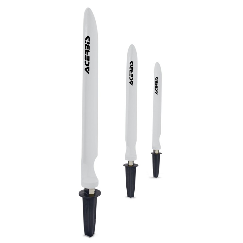 Acerbis track markers are highly visible yellow plastic stakes that are easily installed in the dirt on the side of the track. Not only do these stakes give the track a clean, professional appearance, they also are safer and easy to move than hay bales. As hay bales sit at the edge of the track, they become water logged from track watering. This can make them almost impossible to move, and hitting one or catching one with a footpeg almost always results in a crash. The design of our track markers allows the them to fold down when struck by a bike or quad, and then pop right back up. Also, they are quick and easy to move around because they simply press down into the dirt.