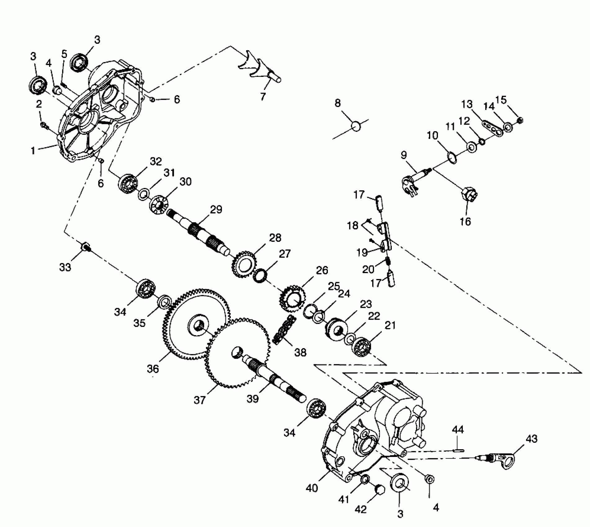 GEARCASE ASM,PRD. Substituted by 1341124 (Incl. 1-32, 34-42, 43, 44)