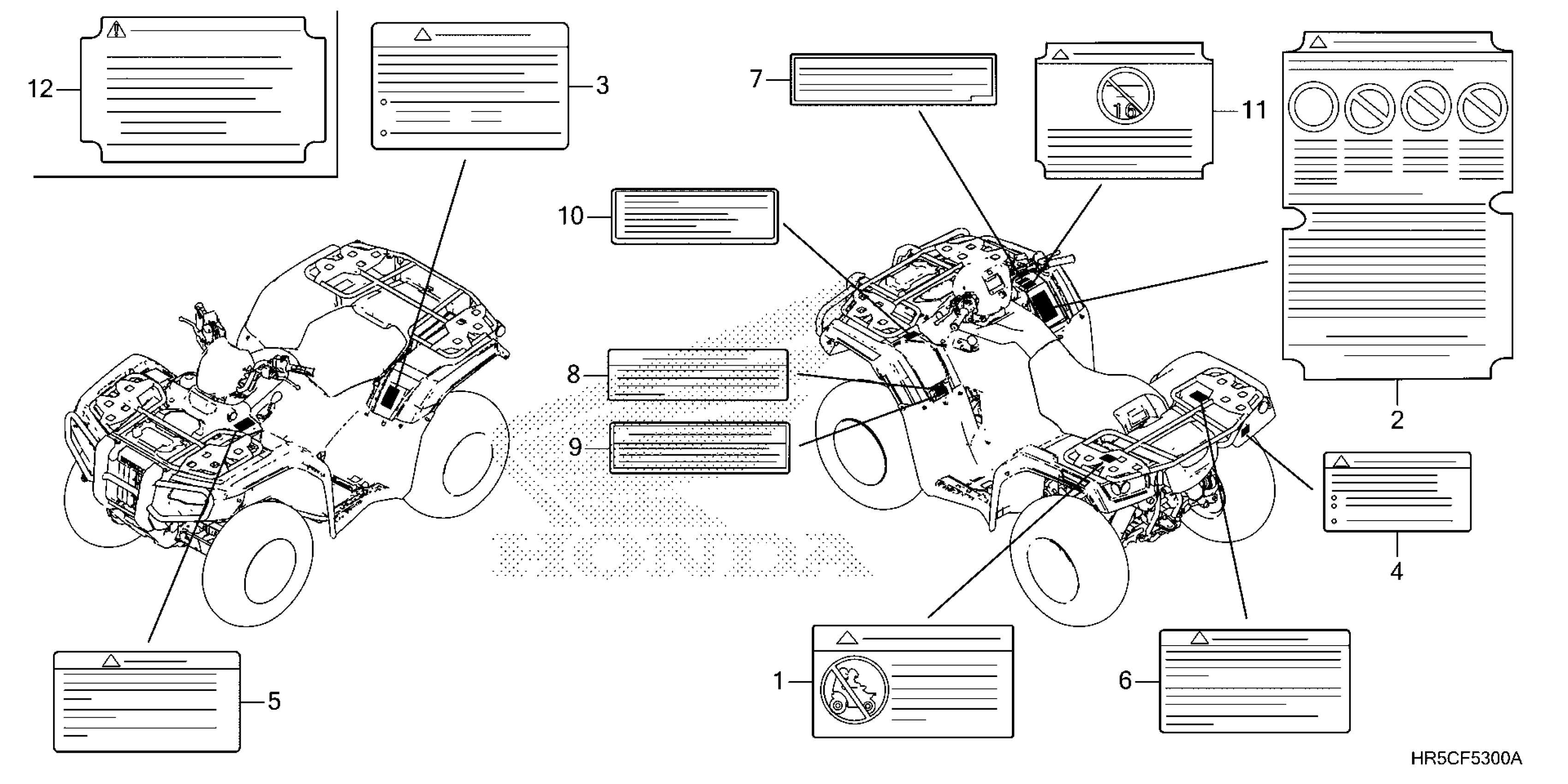 Honda TRX520FM62A (24) ALL-TERRAIN VEHICLE (ATV), USA, VIN# 1HFTE45E-R4900001 TO 1HFTE45E-R4999999 CAUTION LABELS Diagram