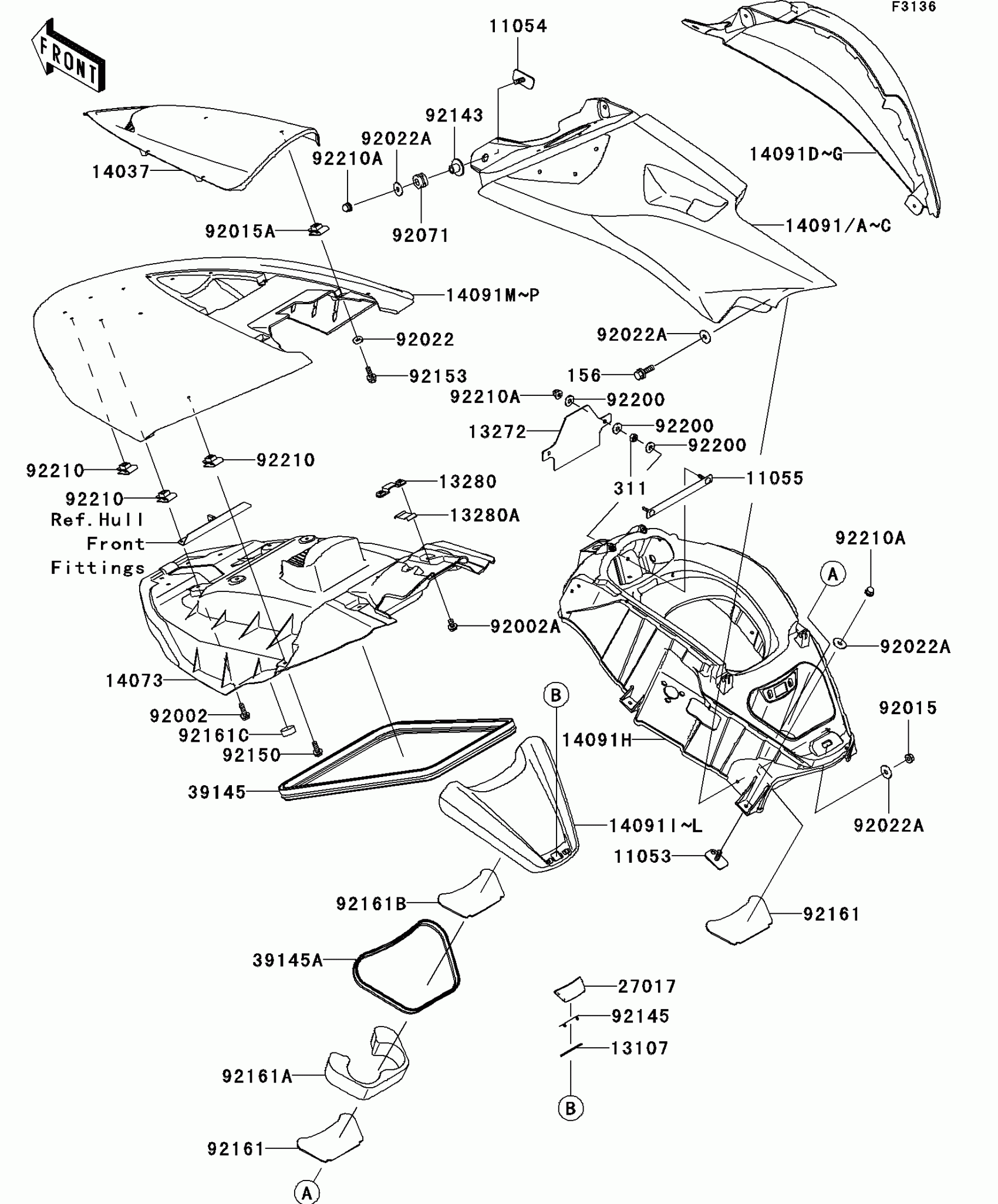 Kawasaki Ultra 250X Hull Middle Fittings Diagram
