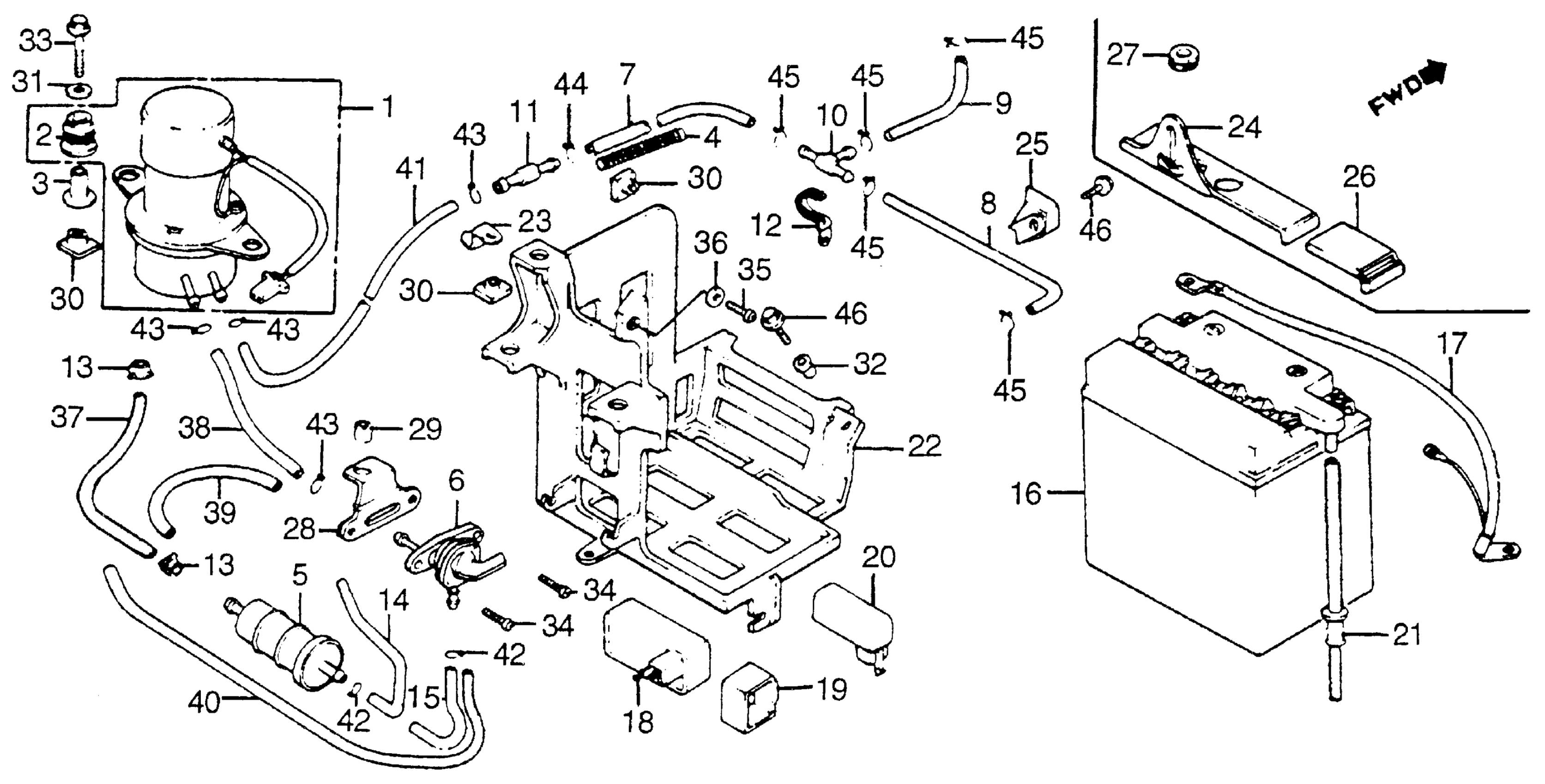 Honda VF750CA (83) V45 MAGNA, JPN, VIN# JH2RC071-DM100011 TO JH2RC071-DM122819 BATTERY + FUEL PUMP Diagram