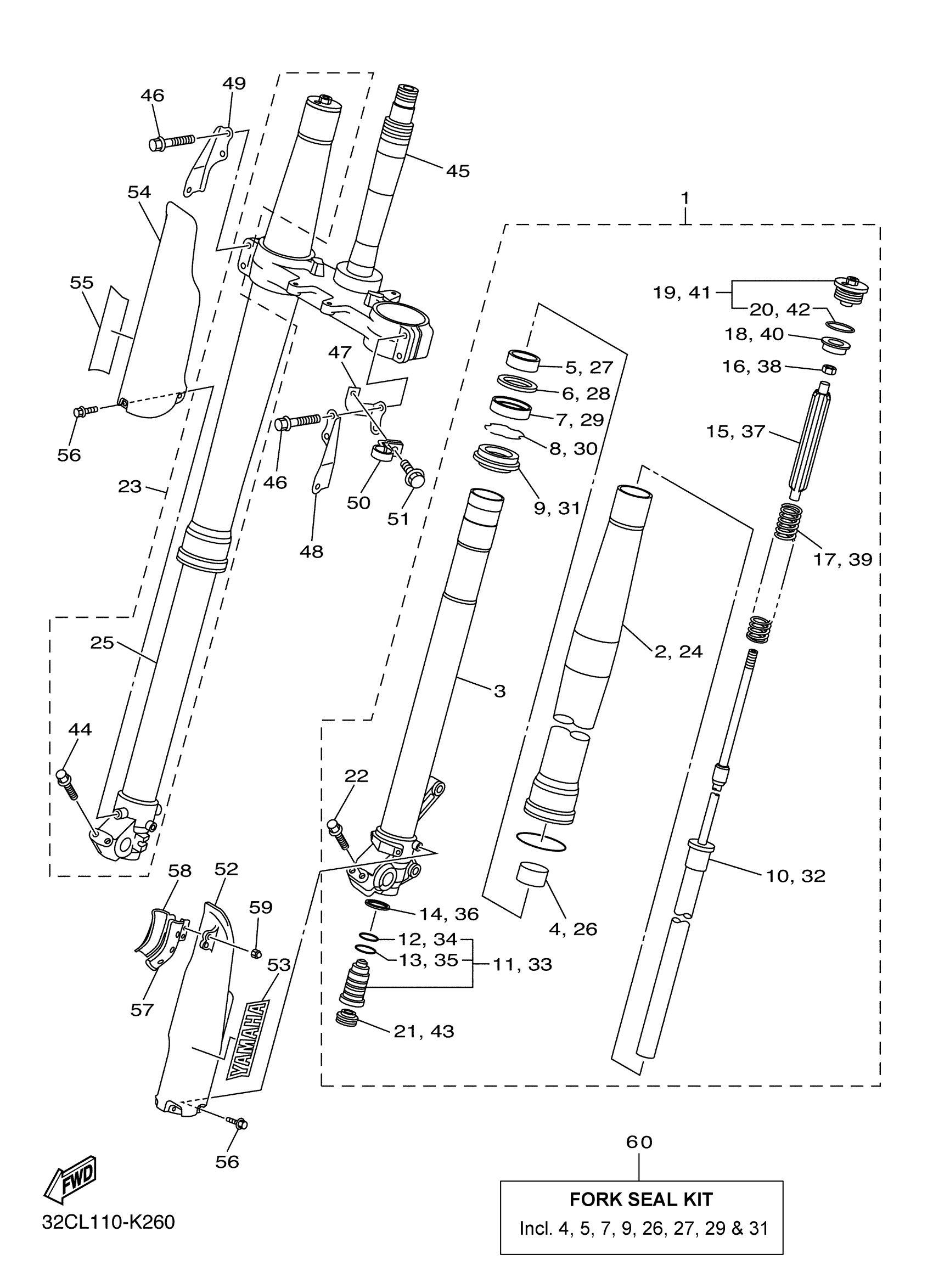 Yamaha WR25XAW (WR250X) 32CL 2011 FRONT FORK Diagram