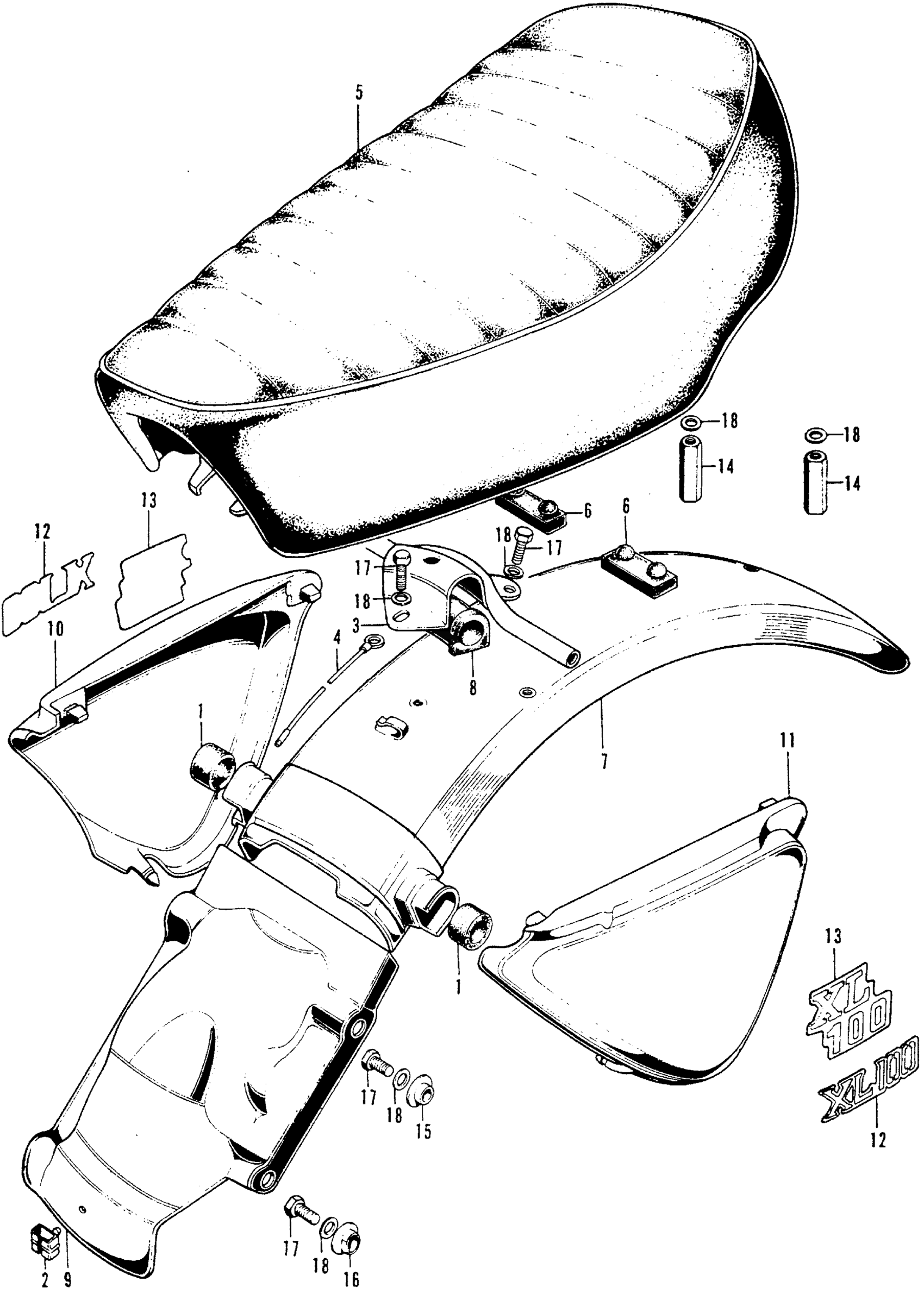 Honda XL100K1A MOTORCYCLE, JPN, VIN# XL100-1100004 SEAT + REAR FENDER + SIDE COVER Diagram